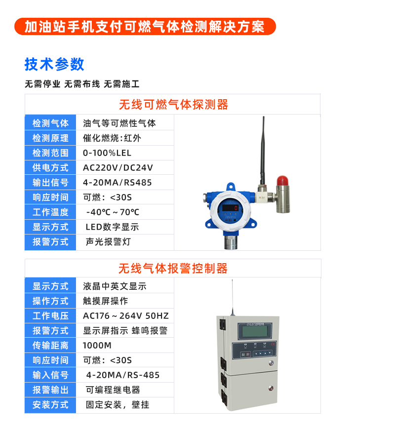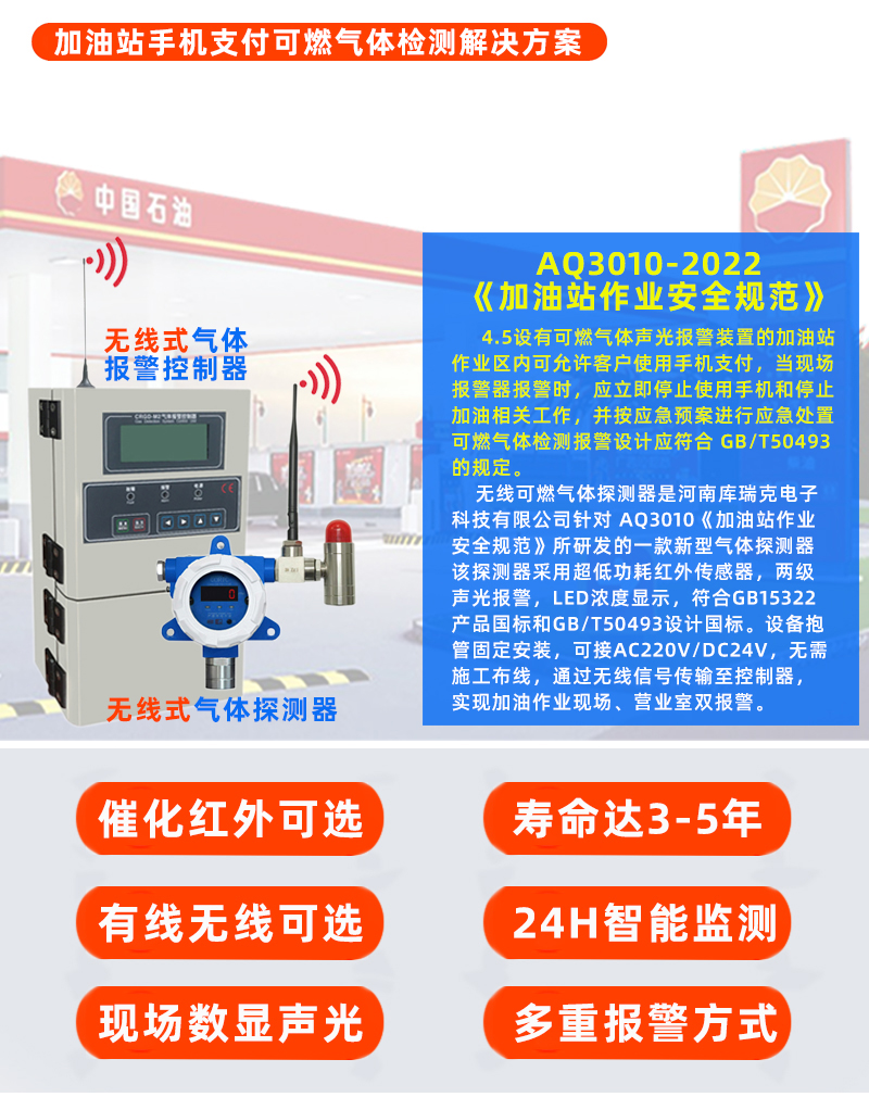 无线可燃气体探测器是河南库瑞克电子科技有限公司针对AQ3010《加油站作业安全规范》所研发的一款新型气体探测器。该探测器可采用催化燃烧传感器或红外传感器, 两级声光报警, LED浓度显示, 符合GB15322产品国标和GB/T50493设计国标。具备抱管固定安装方式, 无需施工布线, 即放即用, 通过无线信号传输至控制器, 实现加油作业现场、营业室双报警。